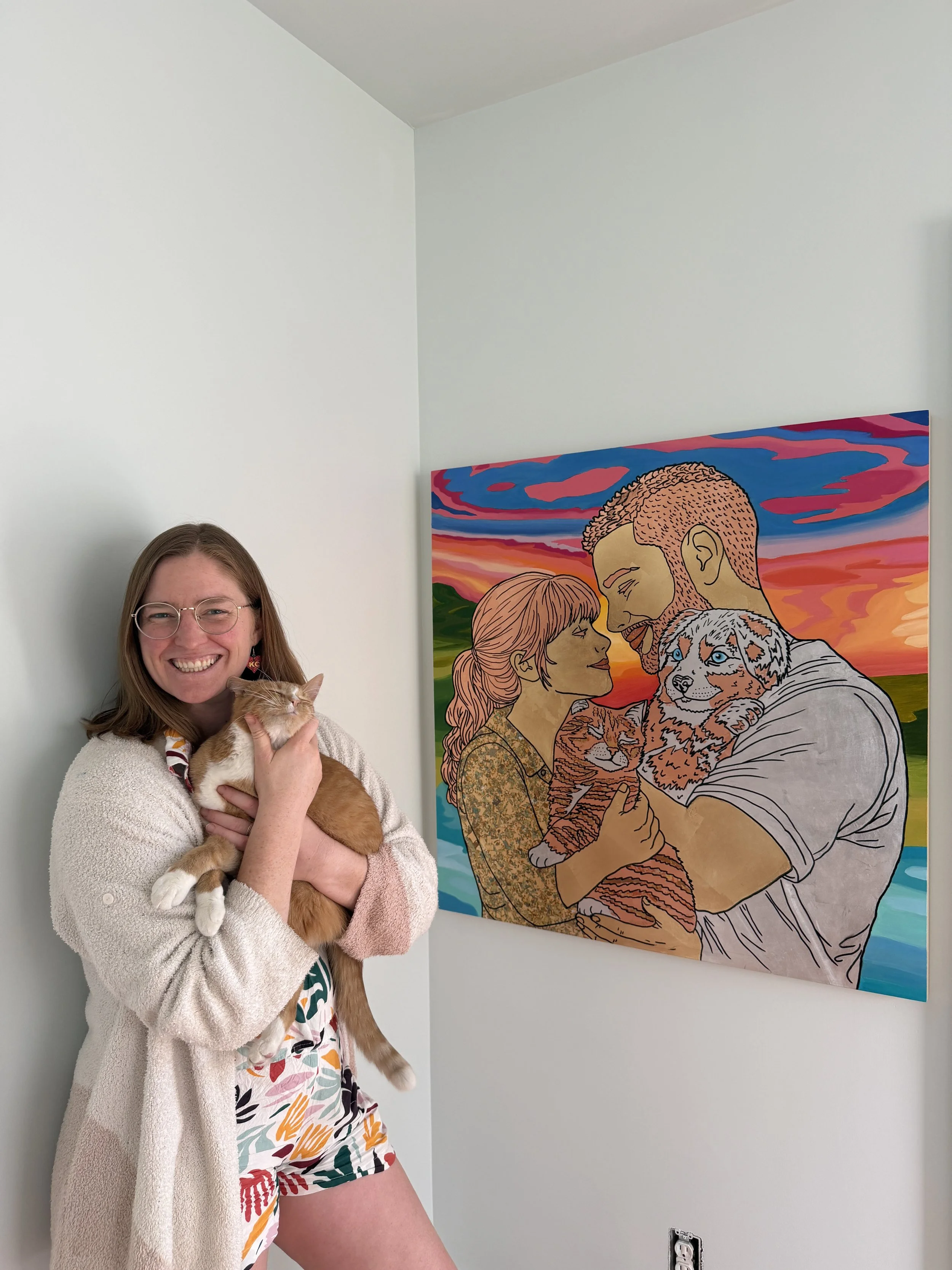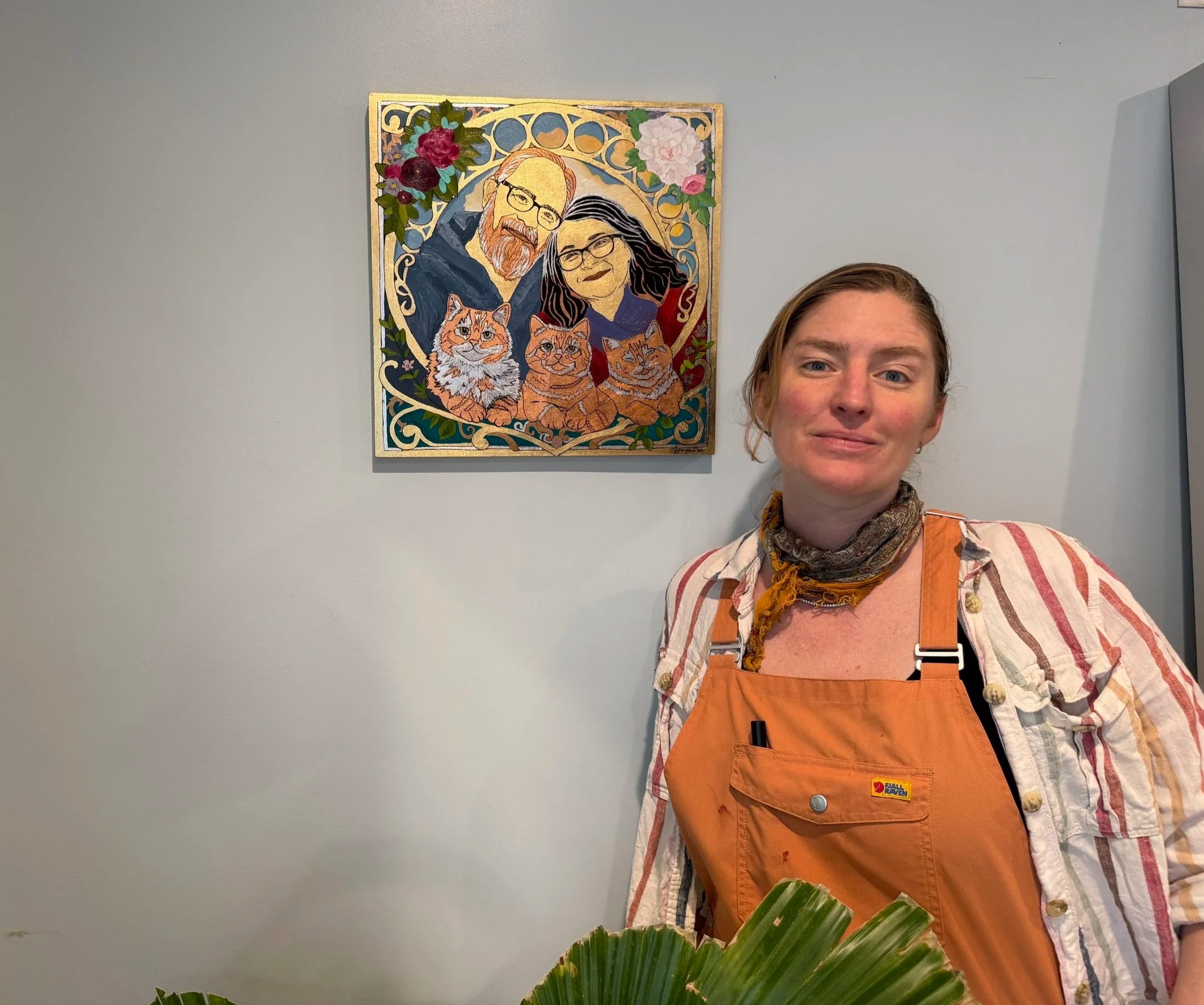 My paintings blend oil, acrylic, and hand-applied metal leaf to create surfaces that shift with the light and draw people in. I’m inspired by the beauty of adornment, the warmth of home, the stories we share with the people and animals we love, and the layered character of Kansas City itself. From meaningful portraits to place-based works inspired by local landmarks, each piece is created to hold memory, atmosphere, and emotion.